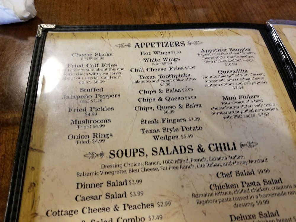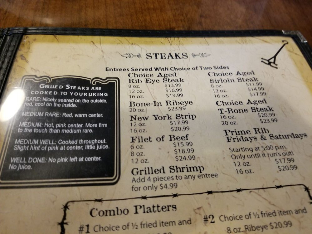 Choose a meat preparation: Rare, Medium Rare, Medium, Medium Well, Well Done. Choose a first item: Fried Chicken Breast, Chicken Fried Steak, Fried Calf Fries, Fried Catfish Fillets, Fried Chicken Strips. Choose a second item: Fried Chicken Breast, Chicken Fried Steak, Fried Calf Fries, Fried Catfish Fillets, Fried Chicken Strips.