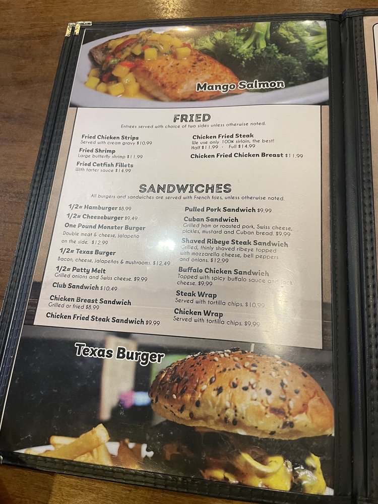 1 choice of 1/2 fried item. Choose a meat preparation: Rare, Medium Rare, Medium, Medium Well, Well Done. Choose an item: Fried Chicken Breast, Chicken Fried Steak, Fried Calf Fries, Fried Catfish Fillets, Fried Chicken Strips.